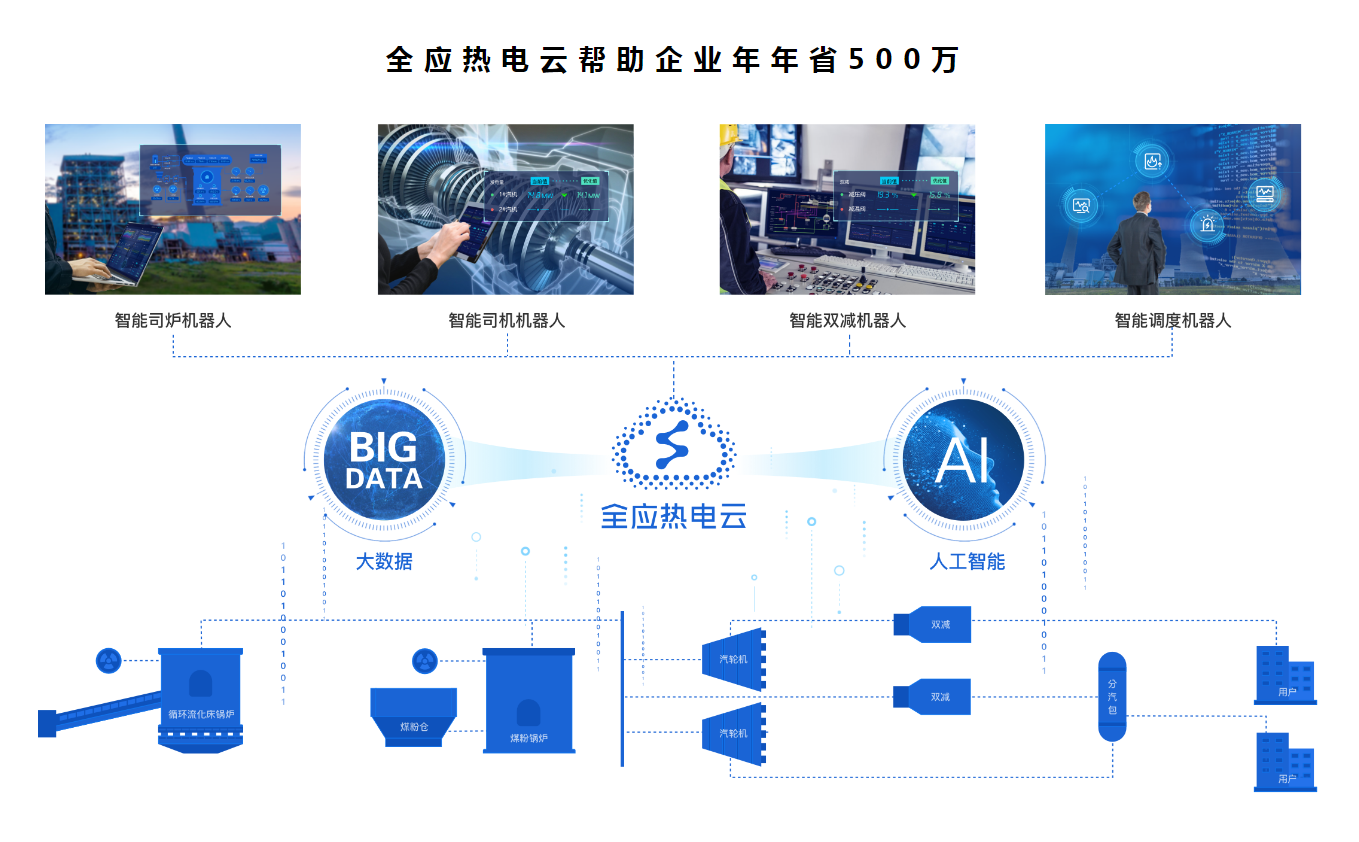 全应科技成立于2016年,创始人为工业智能专家夏建涛博士,是一家聚焦热电生产过程智能化的工业互联网创新型企业,为上海市双软认证企业和高新技术企业。全应科技自主研发的ALLSMART全应热电云工业互联网平台能够为热电生产企业提供实时在线端到端生产工艺优化与控制,能够有效提升热电企业生产效率,降低煤炭消耗,提升热能/电能品质,保障生产安全,减少污染排放。全应热电云解决方案采用智能边缘控制器实时采集锅炉运行、汽轮机运行、热能管网、与末端热/电消费数据,采用工业大数据和人工智能算法在云端构建热电生产系统端到端数字孪生模型体系,实时计算最优热电系统整体运行控制参数,有效提升热电系统生产效率,降低运行人员经验不足对能效和安全的影响,为热电企业每年创造数百万元的燃煤节省的经济回报。通过智能监盘、智能告警、智能手机APP等的应用,让热电企业彻底摆脱传统依赖人工经验的运营模式,升级到安全运行、节能降耗、降本增效、清洁环保的智能化工业等级,有效解决目前热电生产面临的精准控制难、负荷分配难、岗位协作难、需求预测难等问题。全应热电云已经为江苏省、湖北省、山西省、陕西省、山东省等地区多家大型热电企业提供在线智能化服务。